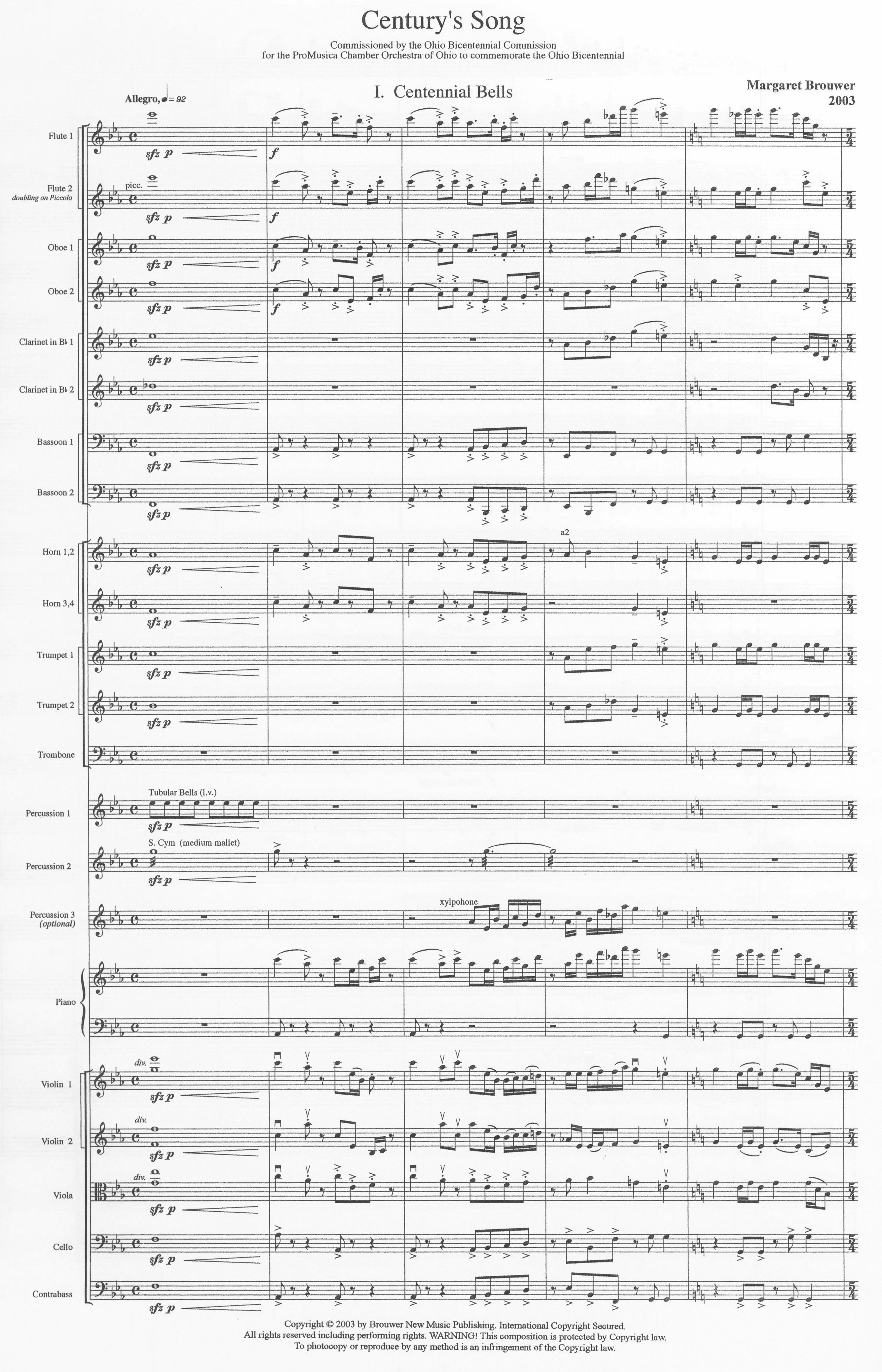 Century’s Song was commissioned by the Ohio Bicentennial Commission for the ProMusica Chamber Orchestra of Columbus, Ohio to commemorate the Ohio Bicentennial. The ProMusica Chamber Orchestra of Columbus first performed it on February 23, 2003 with Timothy Russell, Music Director, conducting. A signature bicentennial event was the casting of a handmade bicentennial bell in each of Ohio’s 88 counties. The ringing of bells therefore became a prominent feature in the energetic fanfare, Centennial Bells. The second movement is a song that the composer set to a poem titled With the Lark by the African American poet from Dayton Ohio, Paul Laurence Dunbar. As requested by the Bicentennial Committee, this movement was composed for choir as well as for orchestra and can be performed by choir and orchestra together or for a cappella choir, or orchestra alone. The last movement is a lively march with occasional quotes from the Red Hill Special, a fiddle tune that can be heard on the recording, Folk Music of Ohio, 1938 through 1940.