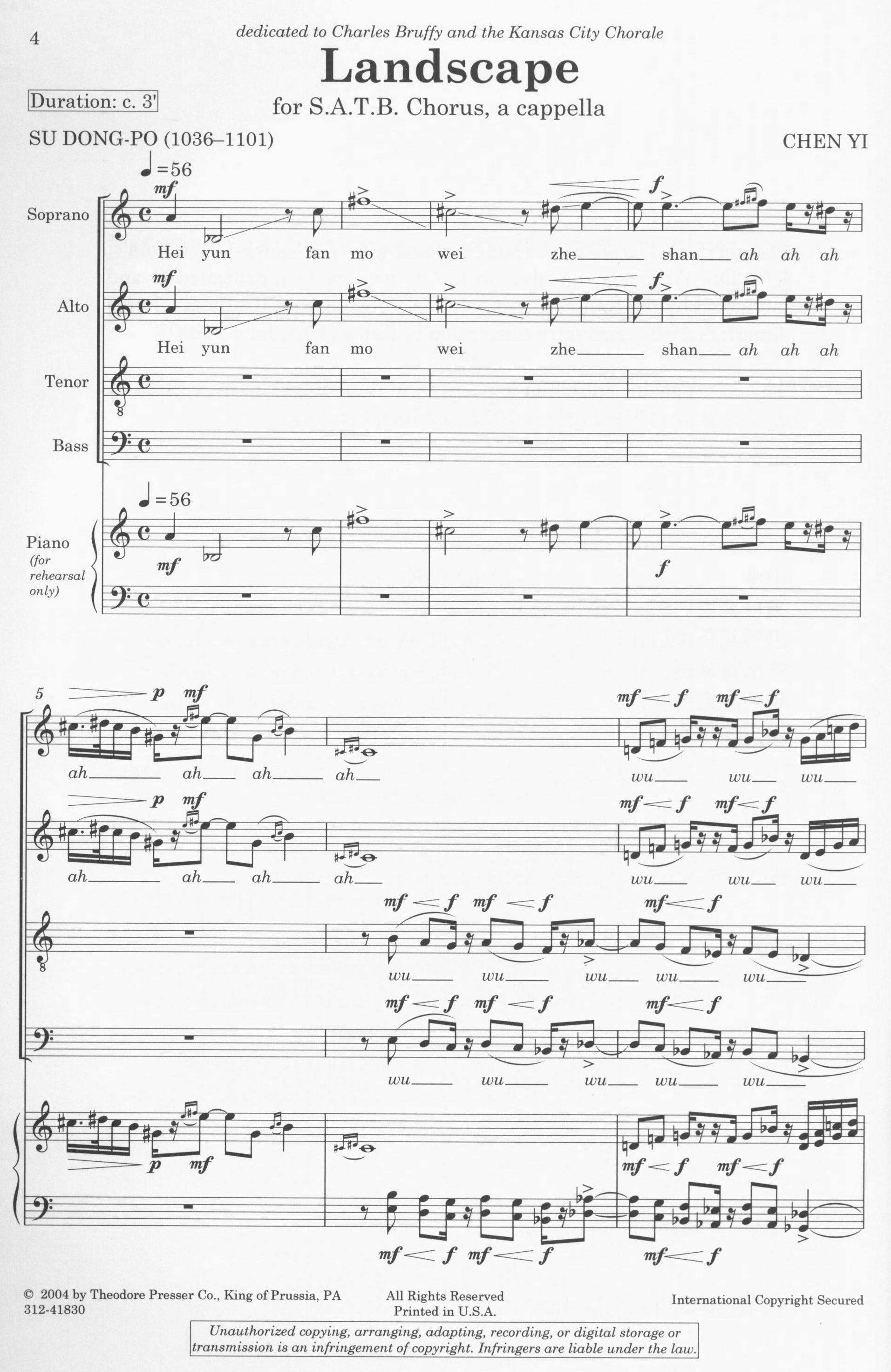 Commissioned by ACFEA Tour Consultants for the Kansas City Chorale, LANDSCAPE is a contribution to Chorus America, dedicated to and premiered by the Kansas City Chorale, led by Charles Bruffy at Chorus America's 25th anniversary convention in Kansas City, June 5, 2003.