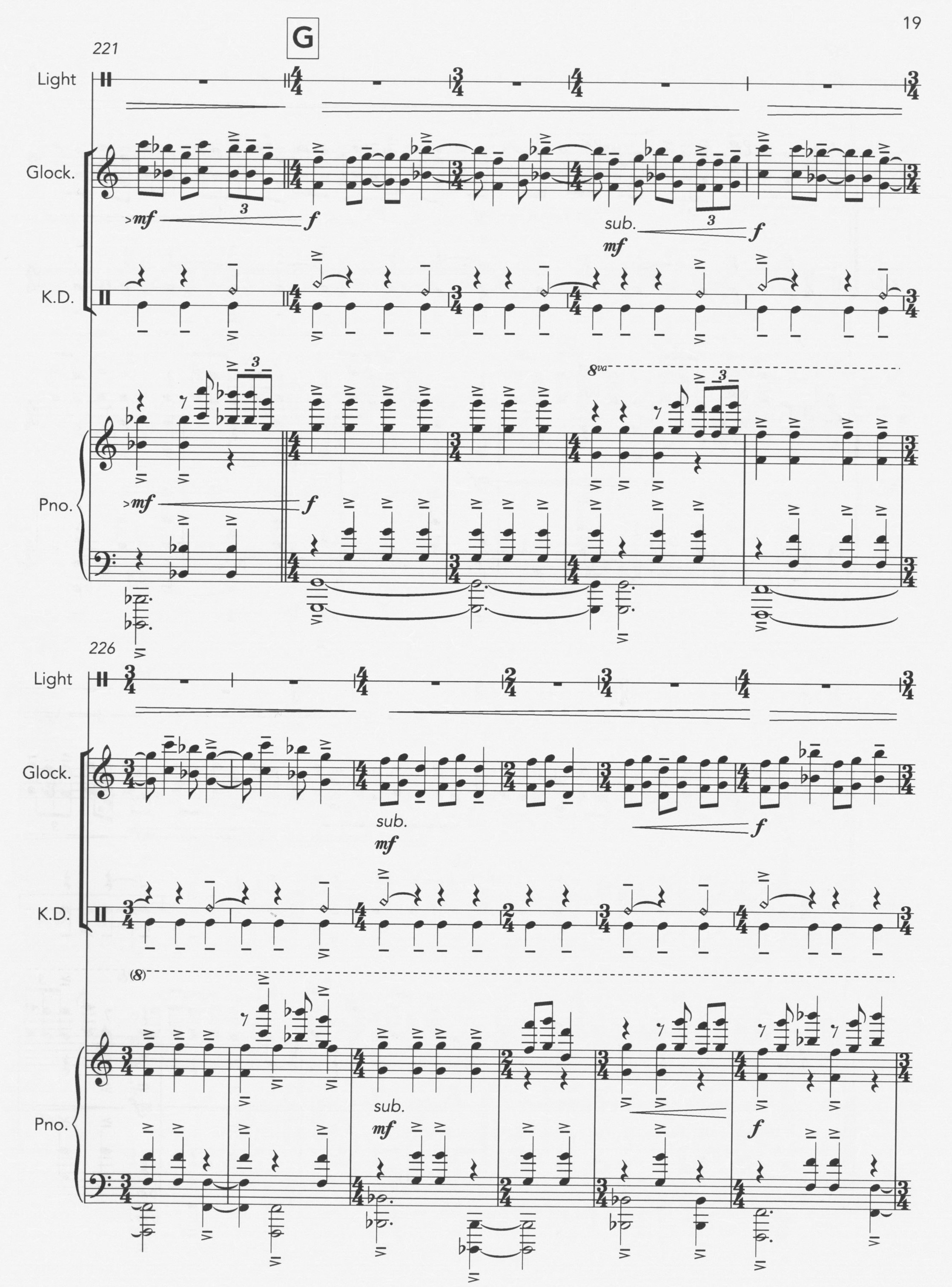Less is More was written in the spring of 2017 for the Passepartout Duo for the inaugural Eighth Blackbird Creative Laboratory, with commissioning support from Elizabeth and Justus Schlichting. The work was written in New Haven, CT, and premiered in June 2017 at Besant Hill School in Ojai, CA. With this work, I wanted to engage in perhaps two artistic “guilty” pleasures of mine: pulse and light, and thus I also composed a lighting part for the piece which I aimed to have equal importance to that of the live performers. I wanted to observe what would happen musically, visually, and overall aesthetically if I lay my two “guilty” pleasures out in the open, with minimal tactile material yet perhaps maximal capacity for interaction and synergy. I therefore hope that through exploring such a minimal yet boundless interaction, I am able to truly uncover what is less and what is more.